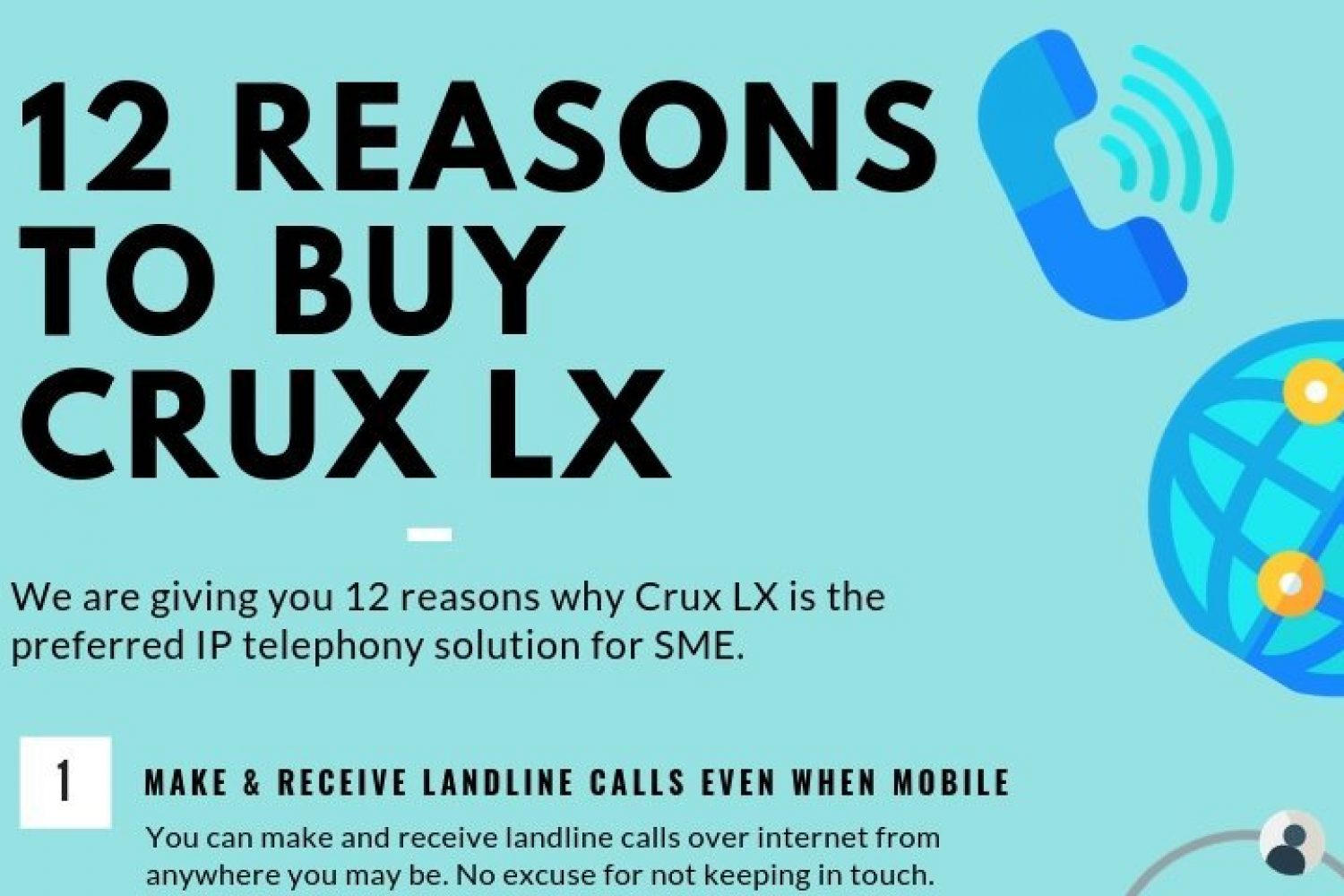 10 Mar 2019 admin Product March 10, 2019 admin Feature Series #1 – 12 Reasons to Buy Crux LX We are giving you 12 compelling reasons why Crux LX is the preferred IP telephony solution for SME. 12 Reasons, crux lx, ippbx, pbx, sme, telephony